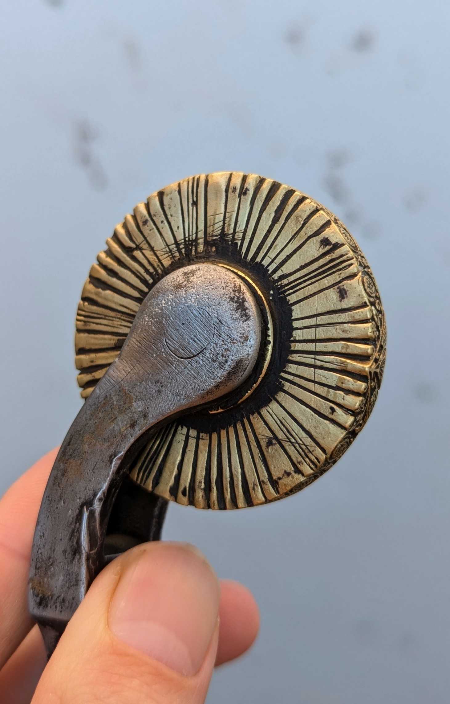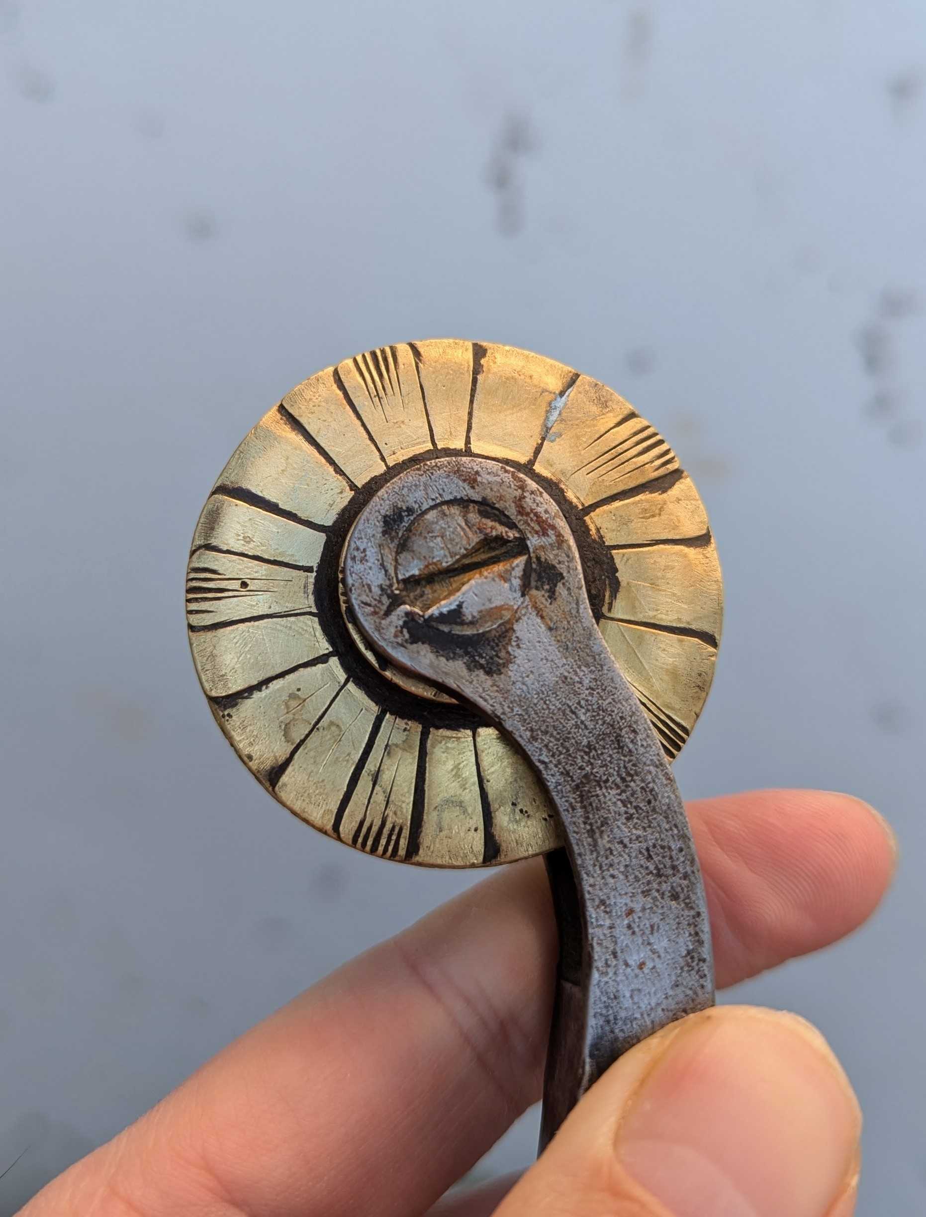 These lines in some places to not match up exactly with the final engraving on the edge of the tool, meaning they could be guide lines engraved by the engraver when they started working on the wheel - guiding the layout of the design. 18th and early 19th tools can have similar radial lines, but these normally only extend half an inch into the side of the roll, there are no other examples I have found of radial lines extending all the way to the axel. This less standardised filing process is perhaps consistent then with earlier production - although lack of comparable examples does not help. It certainly rules out production by a professional engraving house of the late 18th or 19th century.