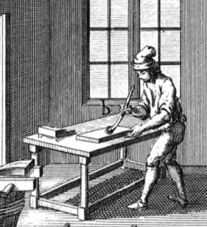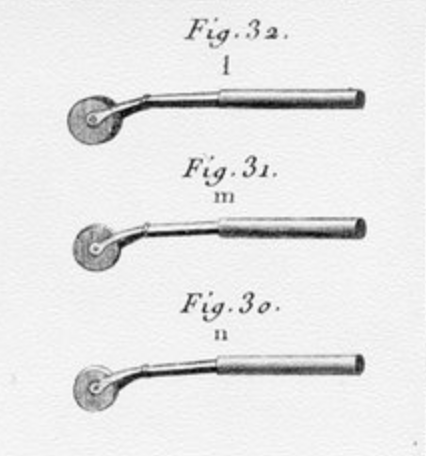 Tom also explained that the standardisation of English and American wheels at around 3 inches in diameter occurred in the early 19th century. My roll, at 1.8 inches, sits firmly below this standard, and Tom had found wheels around this size in French 18th-century engravings.