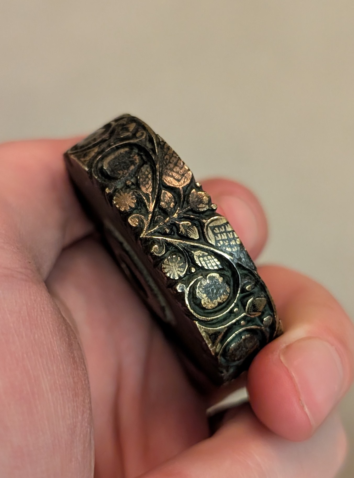 One interesting piece of evidence is that the tool is not stamped or "signed" by its engraver. This is a strong indicator of an early date. Maker's stamps and signatures on bookbinding tools only became commonplace in the trade after the Industrial Revolution. This shift occurred because toolmakers began specialising and selling their products widely, rather than just supplying local binderies - as early as the 1820s companies like Paas were selling through catalogues. If this tool were a standard 19th-century tool (especially one as intricately and carefully engraved as this one), it almost certainly would bear the mark of a toolmaker. The lack of a signature again points to its creation before the era of industrialised finishing tool making.
